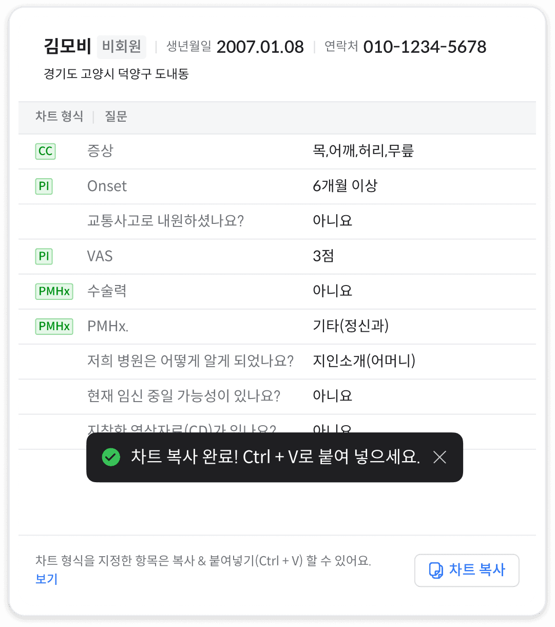 약관과 문진표를 전자화해 자동 저장하고, 접수 시간을 단축합니다.