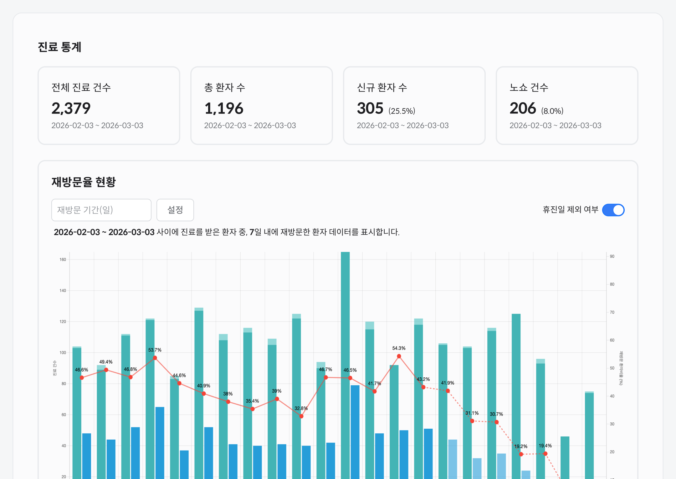 동종 과목 환자 추이와 이탈 조짐을 빠르게 파악할 수 있습니다.